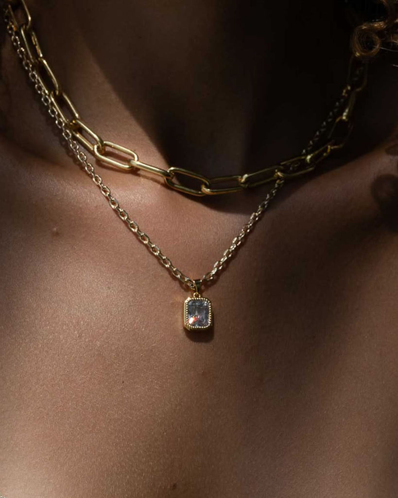 Adding statement shine to your looks, this gorgeous crystal pendant necklace is gonna be your new BFF. Set on a trendy link chain, this necklace features a rectangular pendant with the cubic zirconia crystal in clear color. Pair it up with another chain necklace for double impact, or wear solo for a minimal look. From drinks to dinner and beyond, this striking zirconia necklace will effortlessly elevate your evening outfits and make you shine brighter than ever.